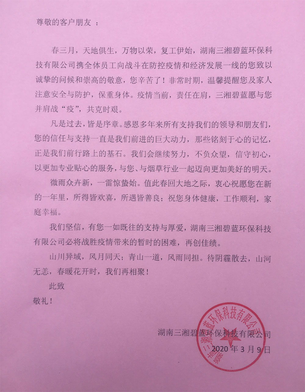 导读:春三月,天地俱生,万物以荣,复工伊始,湖南三湘碧蓝环保科技有限公司携全体员工向战斗在防控疫情和经济发展一线的您致以诚挚的问候和崇高的敬意,您辛苦了!