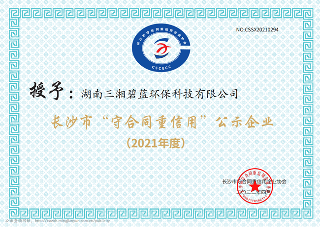 近日,长沙市市场监督管理局向社会公示了2021年度“长沙市守合同重信用”企业名单,湖南三湘碧蓝环保科技有限公司(下称,三湘碧蓝)以规范的合同信用管理体系、诚信守约的经营行为、良好的企业信誉和社会口碑,获评“长沙市守合同重信用”公示企业荣誉称号。
